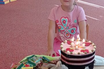 Co jsme si spolu užili? Opékání, hry na večerní zahradě, Večerníček, cesta za svitu baterky nočním Přerovem (kvůli bouřce i s běhostezkou 😄), procházka noční školkou, zpěv písniček o strašidlech a sladké spinkání v školce…